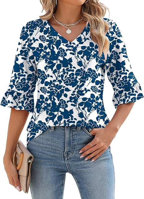 3/4 Length Sleeve Womens Tops Summer V-Neck Blouses